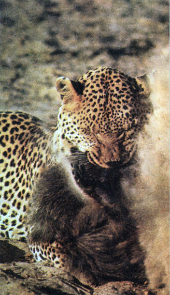 Они двигались очень осторожно. Леопард, если он их и заметил, не обращал на них ни малейшего внимания. Он смотрел только на вопящую беззащитную орду, мечущуюся среди камней. И тут павианы прыгнули вниз. Они упали на леопарда с высоты двенадцати футов. Один впился ему в горло, ухватившись за его шею снизу. Другой вцепился ему в хребет. В мгновение ока леопард задними лапами распорол живот павиану, повисшему на его шее, и схватил зубами второго павиана. Но он опоздал. Первый павиан, умирая, успел еще больше сомкнуть челюсти, и его клыки перервали яремную вену леопарда.