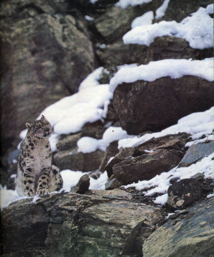 Великолепный снежный барс, или ирбис (внизу), снятый в своей ледяной гималайской твердыне, по мнению многих, принадлежит к самым красивым членам семейства кошачьих. Несмотря на пятна и даже на то, что его иногда называют снежным леопардом, он вовсе не леопард, а принадлежит к особому виду. Его нельзя отнести ни к крупным, ни к мелким кошкам, так как он обладает некоторыми характерными чертами и тех и других и представляет собой как бы эволюционный мост между этими двумя ветвями семейства. Он обитает в высокогорьях Средней и Центральной Азии, и летом его встречают на высоте до пяти с половиной километров. Небольшая кошка с узорчатым мехом, дымчатый леопард (внизу), тоже носит не принадлежащее ей название и тоже представляет собой переходный вид. Мягкая шерсть дымчатого леопарда покрыта красивыми пятнами и полосами, которые делают его почти невидимым в густых джунглях Юго-Восточной Азии и Индонезии, где он обитает. Жизнь его проходит главным образом на деревьях, охотится он в часы рассвета на птиц и мелких млекопитающих. Взрослый дымчатый леопард весит в среднем чуть более 20 килограммов, но благодаря длинным клыкам и крепкому сложению он грозный охотник.