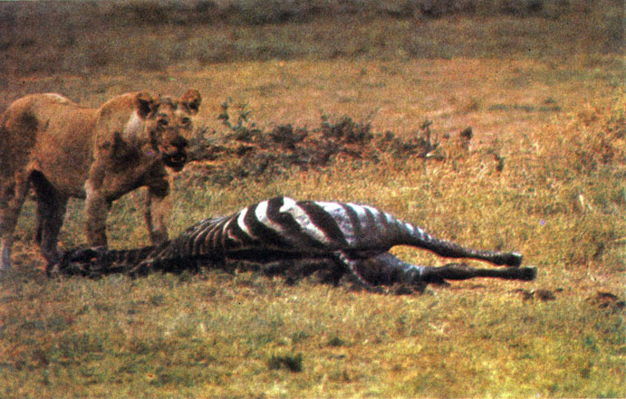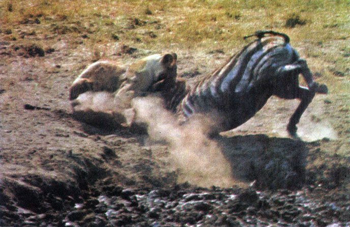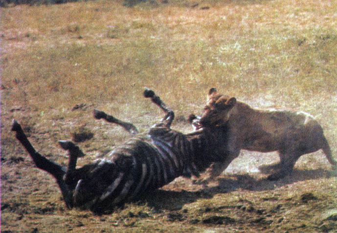 Охотясь совместно, члены прайда убивают добычу быстро и без особого труда. В стремительно наступивших экваториальных сумерках вспугнутое стадо зебр или гну обращается в паническое бегство и мчится прямо на цепь притаившихся львиц. Тут уж львице ничего не стоит отбить намеченную жертву, точно ковбою - теленка во время клеймения, оглушить ее одним ударом и вскочить ей на плечи для решающего укуса в шею. Нередко, однако, первая атака не завершается полным успехом, так как в сравнении с гепардом или леопардом лев - довольно небрежный охотник. Тогда к львице, опрокинувшей добычу, присоединяются ее сестры.