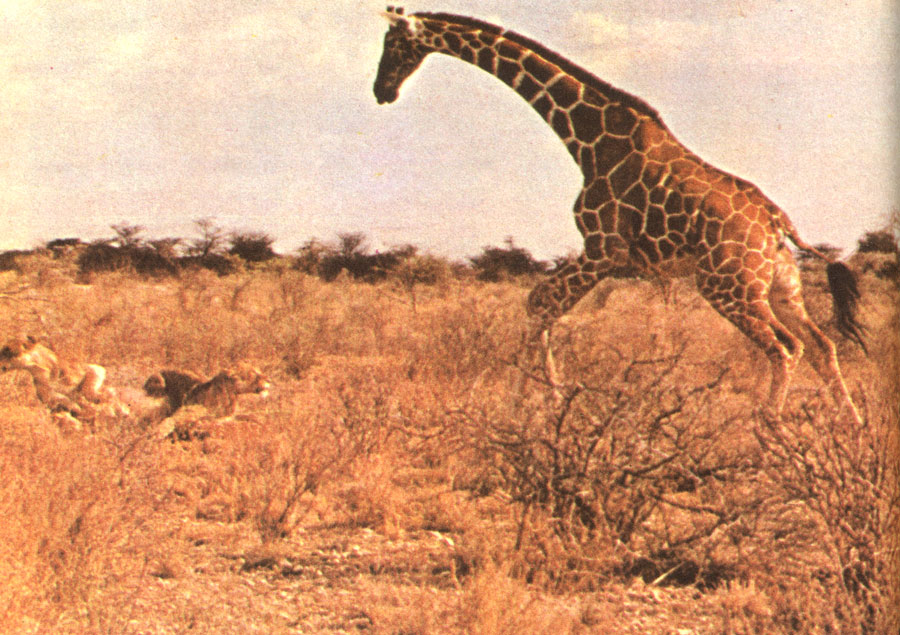 Порой, охотясь, лев из преследователя может превратиться в преследуемого. Две львицы (слева) едва успели убить жирафенка, как вдруг появилась разгневанная мать и после недолгой схватки обратила