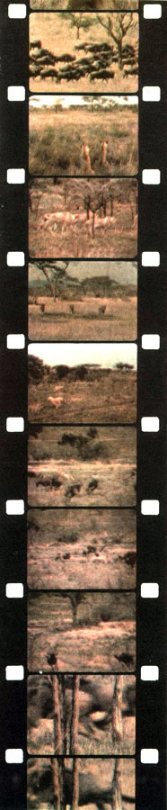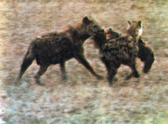 их в бегство молниеносными ударами острых копыт. Львы нападают и на других кошек. Одинокая львица (слева внизу) каким-то образом умудрилась схватить своего родича гепарда, куда более быстрого, чем она, и теперь готова пообедать. Самый лучший план групповой атаки прайда может потерпеть неудачу, как свидетельствует киноэпизод справа. Находчивый гну, окруженный львицами, метался из стороны в сторону, пока не обнаружил разрыва в цепи, и вырвался на открытую равнину, где легко ушел от всех. Не столь стремительный член того же стада (внизу) оказался менее удачлив.Добавки