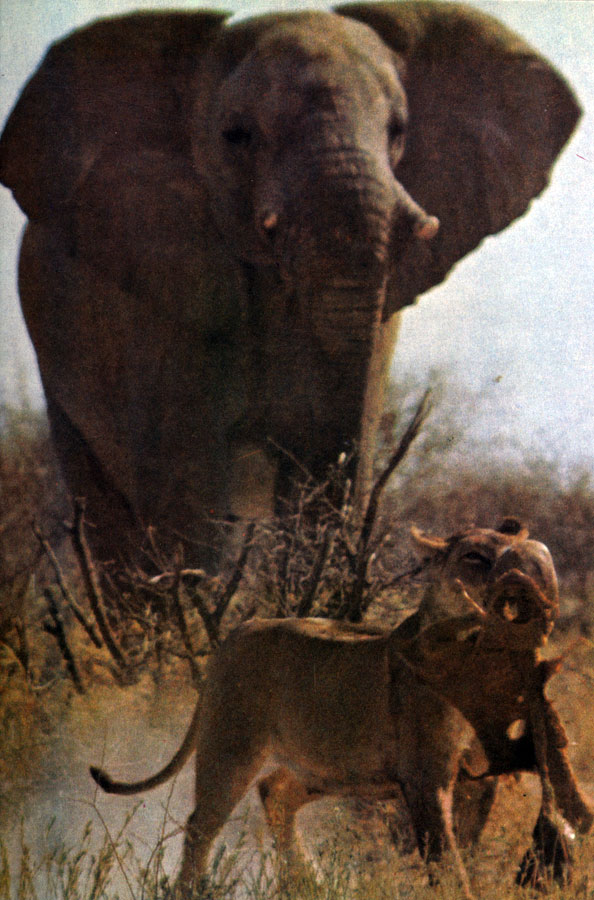Прекрасно зная, что четырехтонный слон не свернет с дороги ни перед одним живым существом, львица благоразумно уносит свою добычу в более безопасное место - это один из тех случаев, когда огромная кошка перед кем-нибудь отступает.