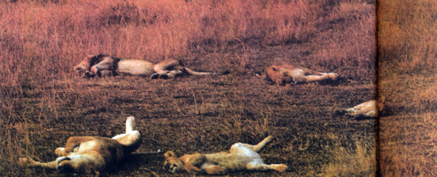 Львы спят в маленьких островках тени или в траве нагретой солнцем саванны по 20 часов в сутки. Полные ленивой самоуверенности, словно ничего не замечая вокруг, члены прайда (внизу) погрузились в сон, подставив солнцу животы, задрав лапы и лишь изредка подергивая хвостами.