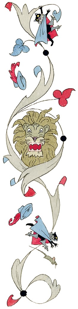 Увидев появившегося в кресле огромного льва, храбрый кот до того перепугался, что выскочил в окно и по водосточной трубе вскарабкался на крышу, хотя в сапогах сделать это было не так уж легко.