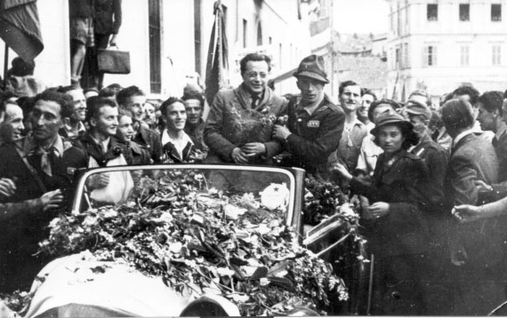 Тереза Мондини с Чинно Москателли и командирами других партизанских отрядов на улицах одного из освобожденных итальянских городов, 1945 г.