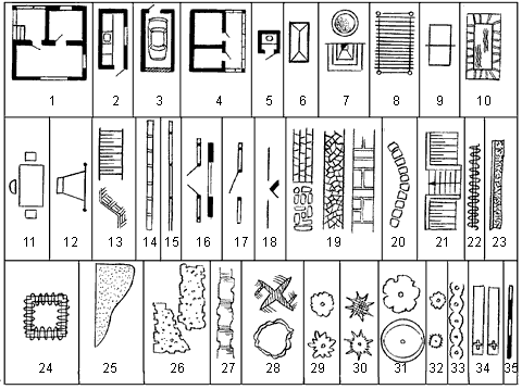 Рис. 2. Условные обозначения, используемые при нанесении плана участка на бумагу: 1 – дом; 2 – летняя кухня; 3 – гараж; 4 – хозяйственные постройки; 5 – дворовый туалет; 6 – компост; 7 – дворовый камин или очаг; 8 – навес; 9 – спортивная площадка; 10 – купальный или декоративный водоем; 11 – уголок отдыха; 12 – детская площадка; 13 – насыпь; 14 – бордюр; 15 – ограда; 16 – ворота; 17 – калитка; 18 – вход; 19 – дорожки; 20 – тропинки с покрытием; 21 – подпорная стенка с лестницей; 22 – трельяж; 23 – вертикальное озеленение; 24 – пергола; 25 – газон; 26 – цветники; 27 – живая изгородь; 28 – высокорослые дикорастущие деревья; 29 – декоративные деревья; 30 – хвойные деревья; 31 – сильнорослые плодовые деревья; 32 – слаборослые плодовые деревья; 33 – ягодный кустарник; 34 – огород; 35 – масштаб