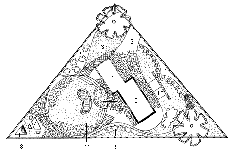 Рис. 4. План участка площадью 500 м2 треугольной формы без хозяйственных построек: 1 – дом; 2 – дорожка; 3 – газоны; 4 – уголок отдыха; 5 – цветники; 6 – розарий; 7 – декоративный кустарник (сирень); 8 – дворовый камин (очаг); 9 – живая изгородь; 10 – небольшая спортивная площадка (с живой изгородью, отделяющей ее от розария); 11 – водоем (бассейн)