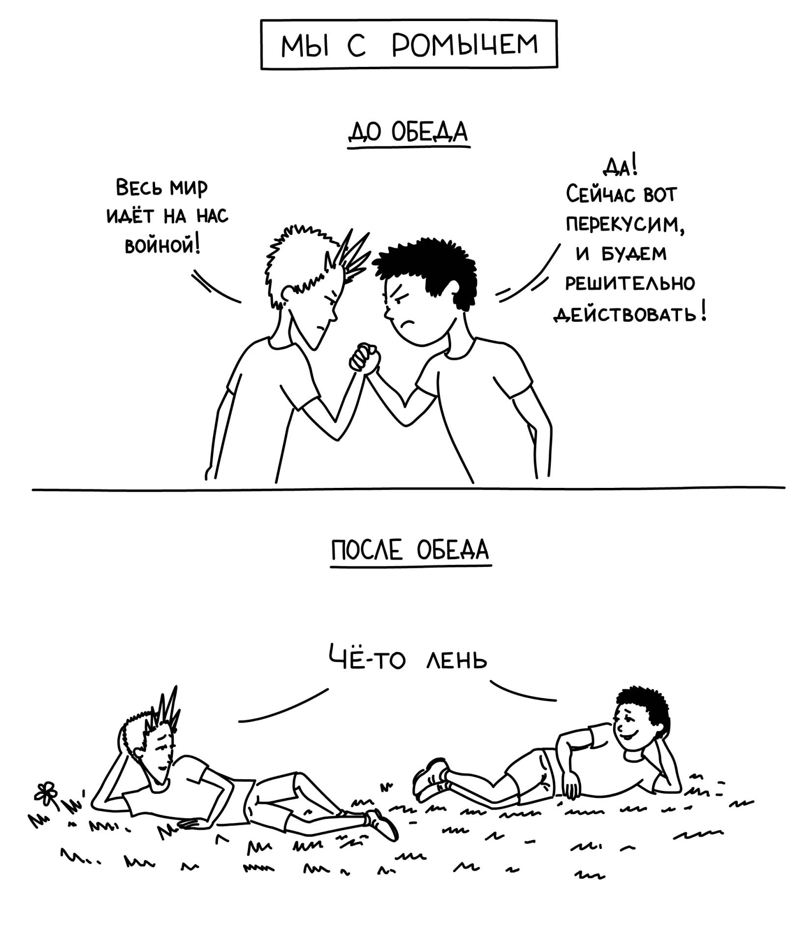 Игорь уткнулся в свою физику по десятому кругу, а мы с Ромычем неспешно и солидно совещались на тему, как бы нам Ероху отселить куда-нибудь. Он в нашей комнате явно лишний. Даже смотреть на него уже невозможно. Но мы были сытые и довольные, поэтому обсуждение шло вяло, а предлагаемые идеи были неагрессивными.