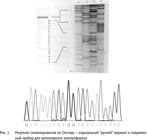 Первые автоматические секвенаторы начала поставлять фирма Applied Biosystems (1986). Они использовали принцип, разработанный в Калифорнийском технологическом институте, в лаборатории Лероя Худа. Что интересно, в первоначальном варианте секвенирования от Applied Biosystems реакционных смесей было четыре, и флуоресцентную метку несли не дидезоксинуклеотиды, а праймеры. Это было своего рода промежуточное звено между сенгеровским методом и последующим автоматизированным – реакция идет в четырех смесях, но все продукты бегут по одной дорожке электрофореза. Эволюция техники иногда похожа на эволюцию живых существ: полезные изменения накапливаются последовательно.