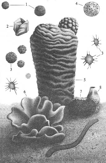 Подобно тому как настоящие летописные свитки именуются по месту их нахождения, получают названия страницы каменной летописи. Вся она подразделяется на два очень неравных по продолжительности интервала — криптозой (3900 — 550 млн. лет назад) и фанерозой (550 млн. лет назад — современный период.) Иногда условно выделяется предшествовавшая криптозою прискойская эра (лат. «прискус» — «предшествующий»), но соответствующих ей отложений (4,6–3,9 млрд. лет назад) на Земле не существует. В криптозое выделяются архей (грен, «древний»; 3,9–2,5 млрд. лет назад) и протерозой (2500 — 550 млн. лет назад.) Последний закончился вендским периодом (605–550 млн. лет назад).
