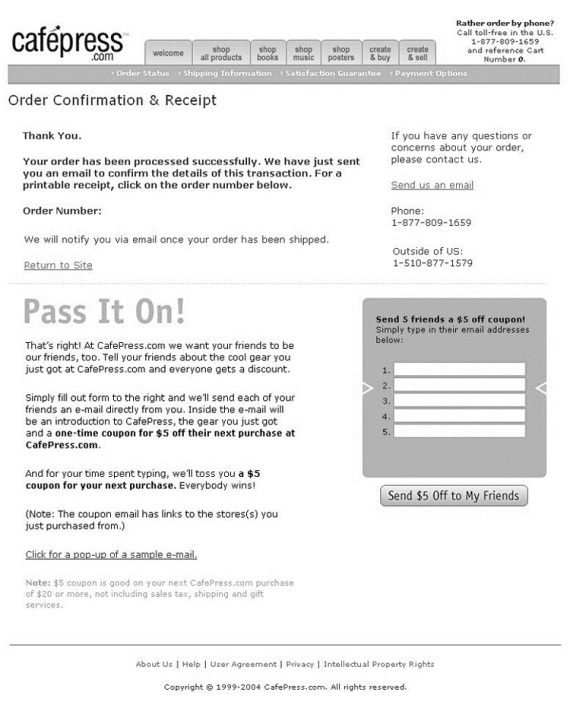 Маркетинговая программа по привлечению клиентов тоже дала отличный результат. Джейн сказал: «Этот метод прекрасно сработал – у нас появилось множество новых покупателей». Опыт сайта CafePress.com показал, что если постараться и сделать каждый этап оформления заказа удобным для своих клиентов, то даже небольшие изменения могут дать отличный результат.