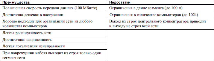 провода, на которые накладывается ограничение – они должны быть скручены по всей длине, кроме концов (1–1,5 см), к которым присоединяют коннекторы. Как и в Ethernet 10Base-T, длина сегмента не должна превышать 100 м.В табл. 2.5 рассмотрены основные достоинства и недостатки Fast Ethernet 100Base-TX.