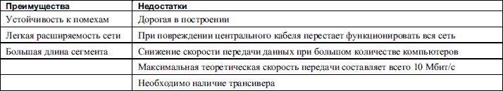 В табл. 2.2 рассмотрены основные достоинства и недостатки Ethernet 10Base-5.