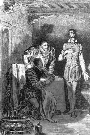 Наутро Дон Кихот встал пораньше и, постучав в перегородку соседней комнаты, попрощался с кавальеро, у которых он вчера вечером был в гостях. Санчо весьма щедро расплатился с хозяином и посоветовал ему, чтобы он поменьше расхваливал припасы своего заведения или уж получше его таковыми снабжал.
