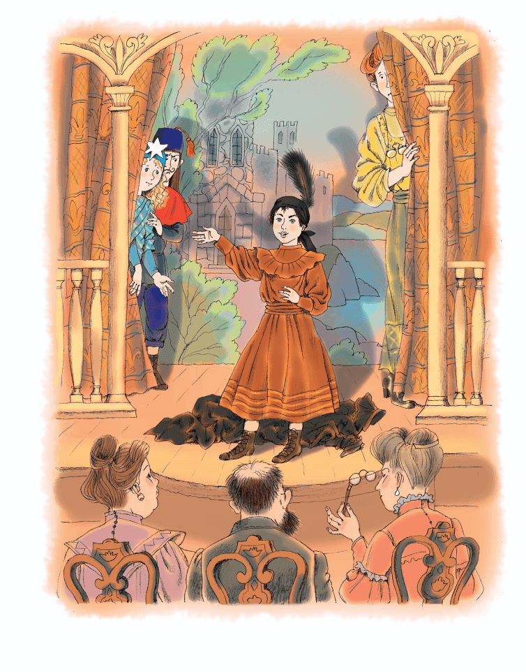 Я смотрю на папу. Это длится секунду или две, но я понимаю, что уползти по-собачьи нехорошо, что раз я взялась сказать какие-то слова, я должна сказать их во что бы то ни стало. Капот мешает мне? А ну его совсем, этот капот! В один миг я расстегиваю пуговицы капота, он остается лежать на полу, я в собственном платье и с пером на голове подхожу к краю сцены, кланяюсь и начинаю говорить, слегка задыхаясь: