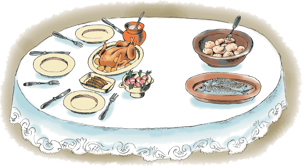 все разошлись. Осталась только я – папа ходит по хатам рабочего поселка.В детской Риты и Зои накрыт стол. Одна половина стола заставлена разнообразной едой. Тут первая бледно-розовая парниковая редиска, горшок со сметаной, сардины, отливающие жемчужно-опаловым блеском, пирожки, жареная курица, прижавшая под мышкой, как портфель, собственный пупок. На другой половине стола – несколько селедок в селедочнице и большая миска с вареной картошкой.