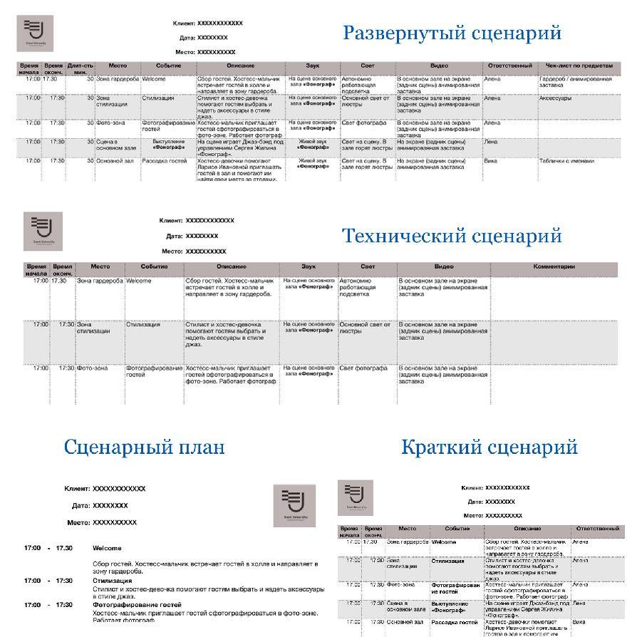 Но, так как сценарий предназначен для большого числа служб и специалистов, которые задействованы в процессах организации и проведения мероприятия, часто необходимо создать несколько документов (их количество зависит от объема подготовительных работ и количества участников проекта). Исходя из этого, сценарии делятся на несколько видов.