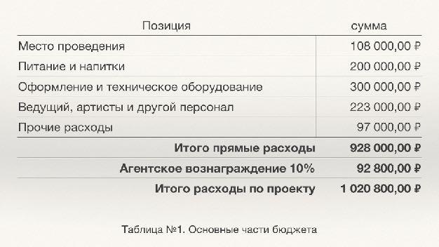 Рассмотрим основные составные части бюджета (таблица № 1). Такой перечень подходит для большинства проектов, однако стоит отметить, что в исключительных случаях существенное значение будут иметь расходы, в нашем списке не упомянутые, и наоборот: некоторые приведенные ниже строки расходов могут отсутствовать вовсе. Цифры, приведенные в правой колонке, условные.