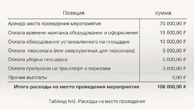 Помимо очевидной строки – аренда площадки – сюда входят многие другие расходы (таблица № 2). Чтобы верно спланировать траты, надо задать правильные вопросы владельцу площадки и выяснить, какие услуги еще не включены в цену. Вот небольшая шпаргалка, которая поможет вам ничего не упустить:
