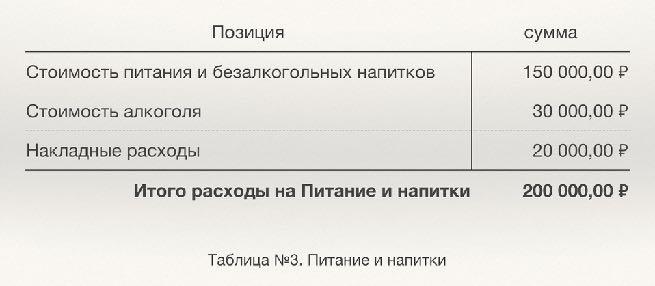 Принципиально эта позиция бюджета делится на два варианта: можно работать в помещении стационарного ресторана или же воспользоваться услугами кейтеринга. В зависимости от выбранного типа обслуживания смета будет складываться по-разному: все составляющие, которые, вероятнее всего, в случае с выездным обслуживанием будут перечислены отдельно, при работе в ресторане будут включены в стоимость блюд.