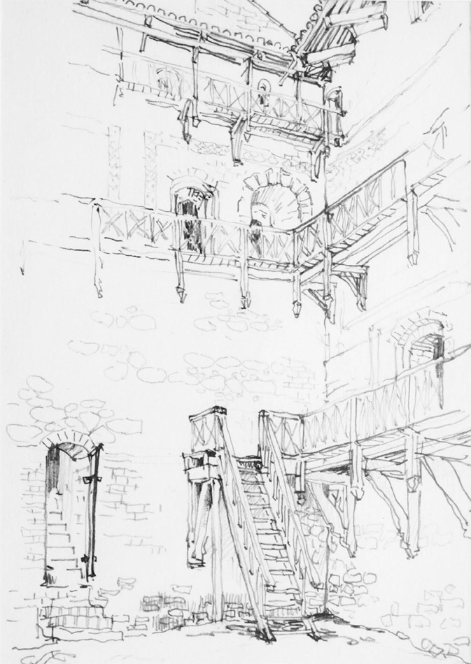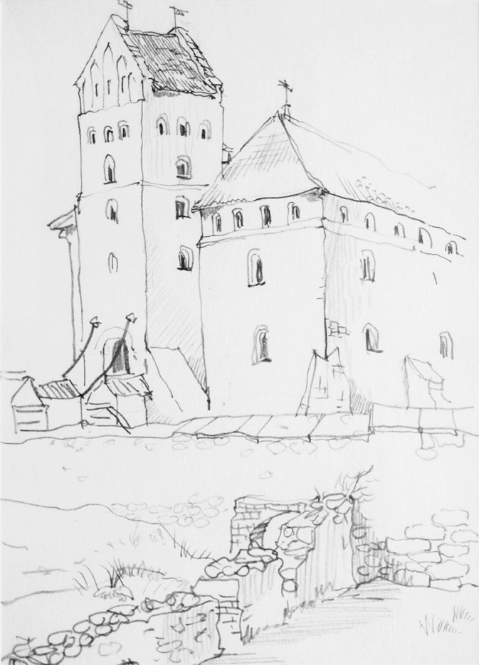 Осмотрев замок, я сделал пару рисунков. Тракайский замок, построенный князем Витовтом в 1409 году – за год до Грюнвальдской битвы – так и не был испытан на прочность. Тевтонский орден, потеряв желание заглядываться на восток, остался в воспоминаниях, замок утратил своё оборонительное значение и оставался лишь резиденцией великого князя. После смерти Витовта замок постепенно приходил в упадок, пока не был окончательно разрушен в 17 веке. А восстановили его совсем недавно – в шестидесятые годы.