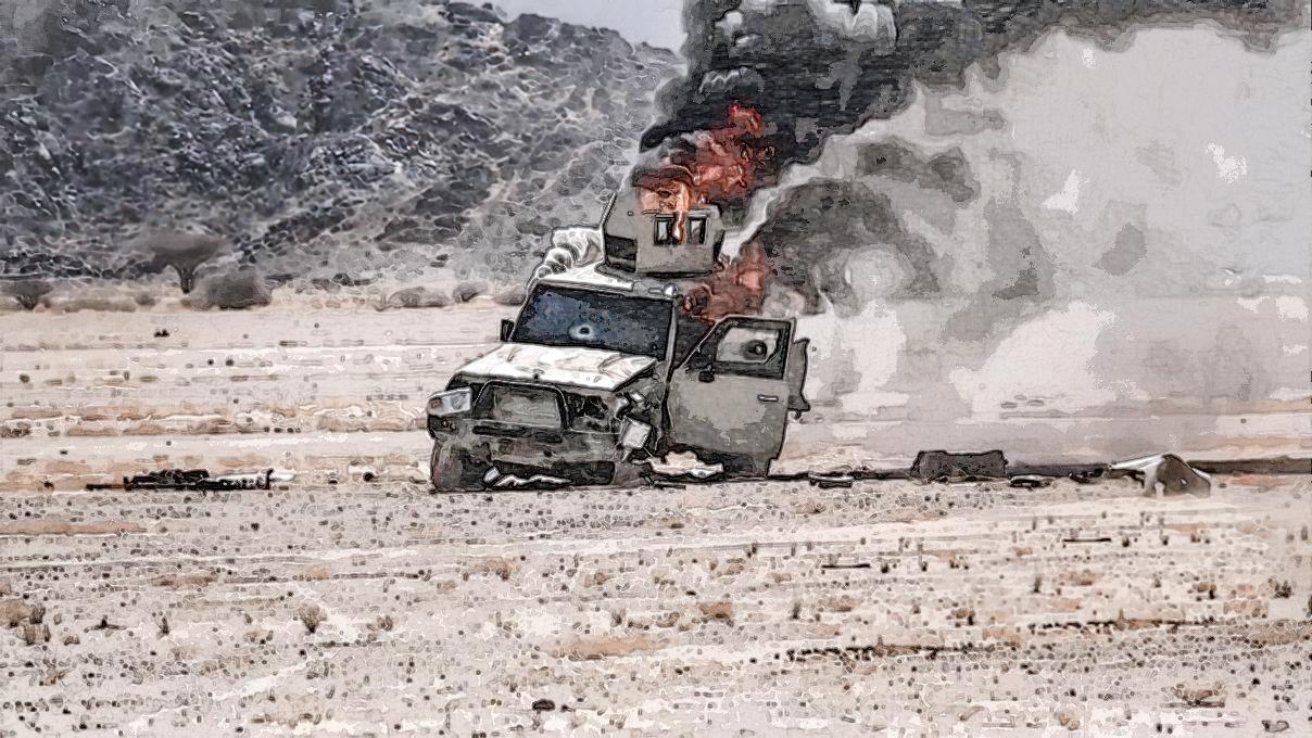 Небо уже подсветилось первыми рассветными лучами, и в утреннем сумраке виден осевший на одну сторону броневик. Два из четырёх колёс по левому борту вывернуты на оторванных взрывом рычагах подвески, машина осела на одну сторону, уперевшись в грунт острым стальным носом. Чуть дальше, в начале прохода, виден дымящийся внедорожник. Но людей нет.