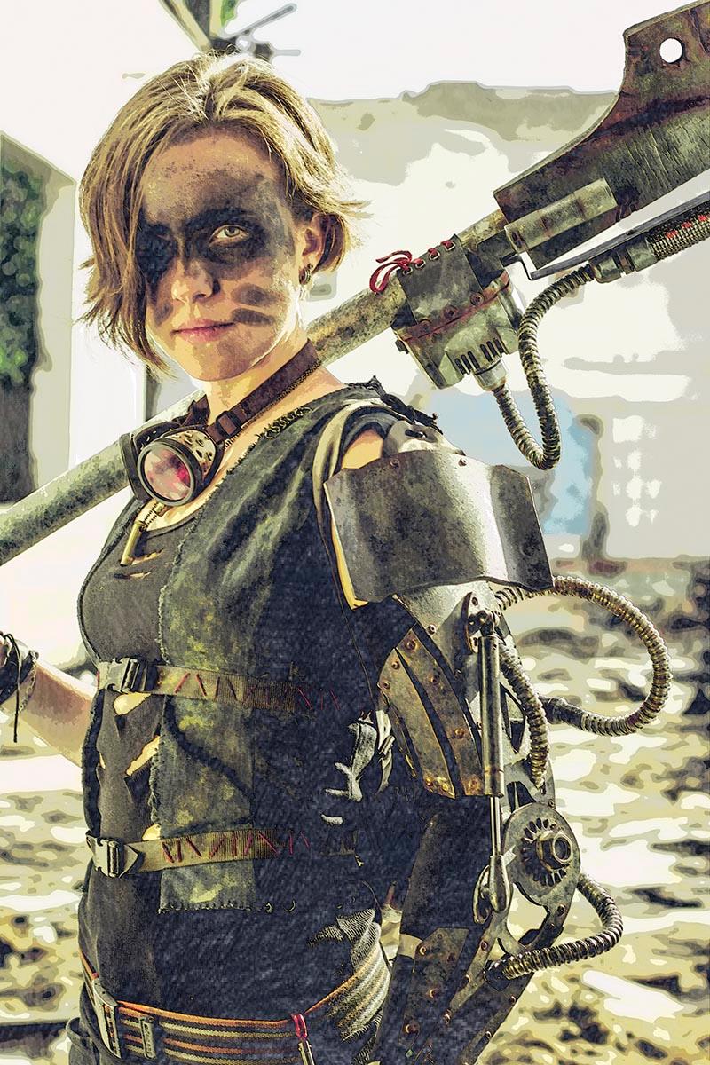 У придорожных кустов стоит девочка, примерно ровесница Васьки. Они даже чем-то похожи – обе курносые, зеленоглазые, светловолосые. Но эта одета в драную жилетку поверх ещё более драной майки, грязные военные штаны и стоптанные ботинки, а лицо её густо перепачкано копотью. Причём, судя по следам от пальцев, копоть эта наносилась специально. На правом плече у девочки здоровенная железяка, похожая на насаженную на стальную трубу алебарду, к которой зачем-то прикрутили сложное электрическое устройство. А ниже левого плеча у неё короткий кусок руки, к которому приделан грубый протез.