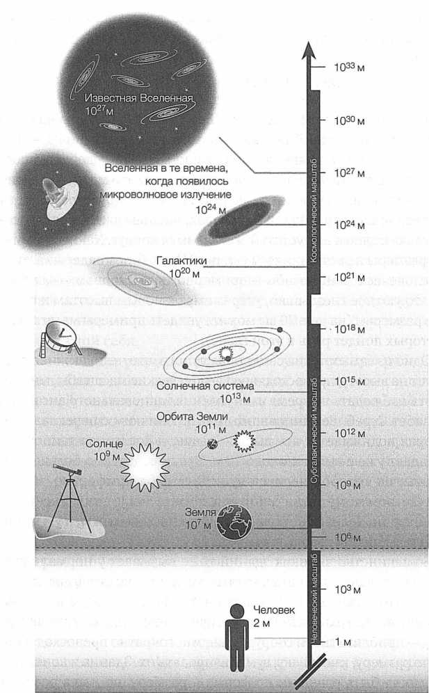 вполне могут оказаться обитателями ранней Вселенной, свет от которых добрался до наших телескопов через миллиарды лет после того, как был излучен. Добавим, что нынешняя сильно расширившаяся Вселенная могла бы многократно вместить более раннюю версию самой себя.Тем не менее размер играет очень существенную роль в интерпретации наших наблюдений — как нынешнего состояния Вселенной, так и истории ее развития во времени, и в этой главе мы поговорим о том и о другом. Во второй части главы мы рассмотрим эволюцию Вселенной как целого, начиная с крохотного первоначального размера и заканчивая большой и сложной структурой, которую мы наблюдаем сегодня. Но сначала мы познакомимся с сегодняшней Вселенной и с некоторыми размерами, характеризующими то, что нас окружает. Мы пройдем по шкале масштабов снизу вверх — от привычных предметов к большим размерам и более отдаленным объектам на Земле и в космосе. Наша экскурсия по большим масштабам и объектам будет значительно короче, чем предыдущее путешествие в глубины материи. Несмотря на богатство структуры Вселенной, большую часть того, что мы видим, можно объяснить при помощи известных физических законов — не фундаментальных, а новых. Формирование звезд и галактик протекает в соответствии с известными законами химии и электромагнетизма — наук, берущих начало в уже рассмотренных нами малых масштабах. Здесь, однако, и гравитация играет принципиально важную роль: все зависит от скорости и плотности объектов, на которые она действует.