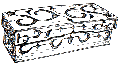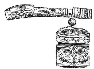 Выше мы уже описали айнское жилище. Его интерьер оформлен несложно. Вдоль стен установлены нары, остальное пространство частично или полностью покрывается циновками, которые в отличие от японских часто бывают узорного плетения. Меблировка айнского дома ограничивается ларями для хранения утвари и низенькими столиками японского образца. Наряду с металлической и лакированной японской посудой имеется и резная деревянная утварь собственного производства — корыта, плошки и т. п. Они чаще всего имеют квадратную или прямоугольную форму. Помимо ложек и палочек для еды среди айнской утвари особо следует отметить ику-нись — деревянные резные планки примерно в пядь. (20–30 см) длиной, которыми мужчины поддерживали усы при ритуальном питье сакэ. Для питья сакэ использовались чайные японские чашки.