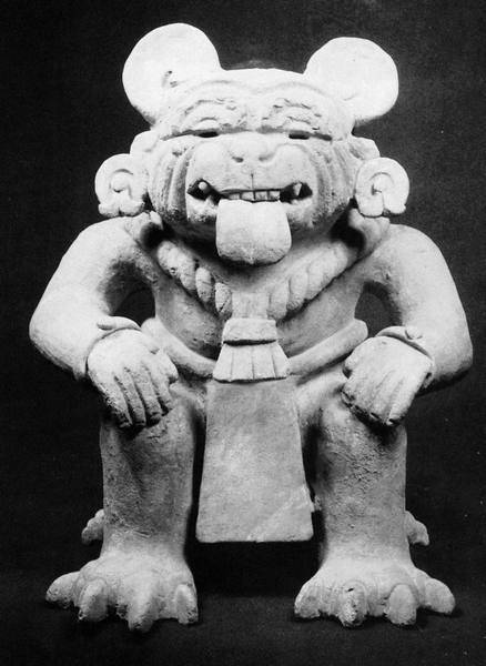 Илл. 19. Погребальная глиняная урна сапотеков, выполненная в виде сидящего с высунутым языком ягуара. Подобные урны помещались обычно в крестовидные ниши внутри погребальных помещений