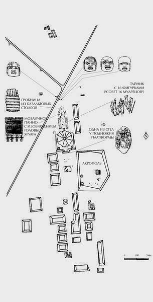 Под этой дорогой-площадкой, символизировавшей уже саму преисподнюю, был помещен тайник с 16 фигурками – изображениями глав родов племени, которые как бы собрались у шести стел с символическими знаками. Сверху над тайником располагалось замаскированное отверстие, в которое можно было смотреть за происходящим. Видимо, ольмекские жрецы ожидали советов от родоначальников племени. Поверх северной части площадки было сложено большое мозаичное наземное панно, изображавшее морду ягуара, под которой располагались четыре подвески, состоявшие каждая из четырех фрагментов, что, безусловно, также воплощало единство племени, состоявшего из 16 родов, организованных в четыре фратрии.