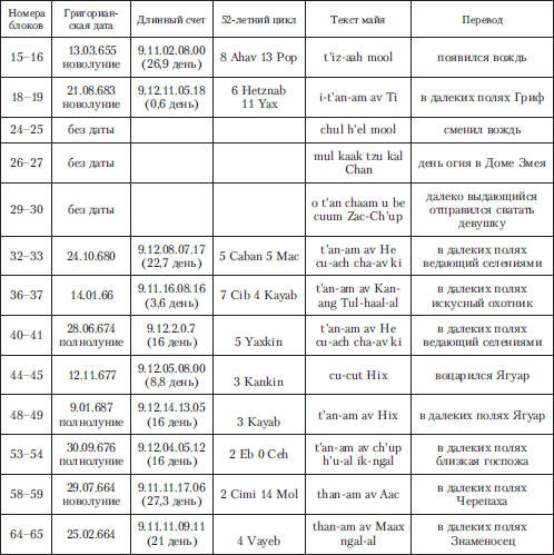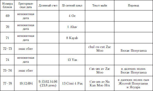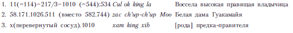 Таким образом, становилось очевидным, что это была не просто жена правителя, но женщина, обладавшая некими общественными функциями – царскими или жреческими. Она держит в руках декоративный блок из знака 59 (предлог «в») и числа 10 (череп как символ бога смерти и числа 10). Вокруг черепа прорисованы пять кружков. Справа от черепа помещена корзина с 12 плодами, которые могут символизировать двенадцатимесячный лунный год, называвшийся на старом языке майя хааб.