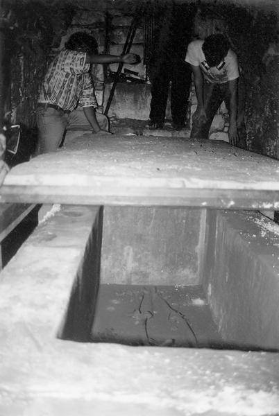 в декоре. Во-первых, верхняя крышка-панель не имела никакого орнамента и размеры ее составляли 2,45 x 1,18 м. На крышке лежала курильница, в нише были обнаружены три свистульки, а в углу камеры – три сосуда, в которых, возможно, была пища. Не было росписей и на самом саркофаге.С восточной стороны в узком промежутке между стеной камеры и саркофагом был обнаружен скелет женщины 35–40 лет и ростом 1,58 м. С западной стороны лежал скелет мальчика 7–12 лет.