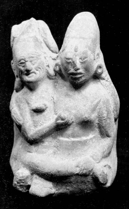 до наступления трупного окоченения. Это положение фиксировалось тонкими веревками или лентами. Потом покойника укладывали на правый или левый бок. Различия касались лишь положения рук: они могли быть подогнуты к грудине, могли быть подняты до головы, как бы покрывая ладонями лицо, а некоторые оказались прижатыми к поясу. Затем тело предавали земле, помещая прямо в специально вырытую яму, посыпали киноварью. Голову покрывали блюдом-триподом или схожим по форме сосудом.Илл. 57. Фигурка из погребения на острове-некрополе Хайна. Сюжет выбран не случайно и посвящен мистической связи юной женщины с далеким прапредком, который, по определению, должен выглядеть «старше всех стариков». Этот миф выражает идею реинкарнации