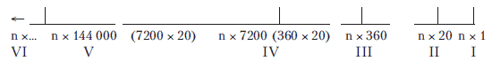 Календарное происхождение подобной записи предопределило привязку единиц первых трех порядков к календарю (1 день – 20-дневный месяц – 360-дневный солнечный год без пяти дней). Каждый порядок может умножаться на золотое число (Метонова цикла), затем единица каждого следующего порядка образуется путем умножения предыдущей на 20 или умножения 360 (уровень III) на 20 (уровень II), возводимое каждый раз в большую степень.