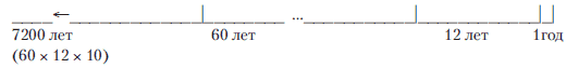Аналогичным способом «сжатия» периодов времени пользуются и народы, живущие по схеме так называемого «восточного» бытового календаря. В его основе лежит сочетание двух повторяющихся циклов: десятикратного и двенадцатикратного. Первый состоит из «элементов», а второй – из «животных». По завершении 60 лет происходит совпадение позиций животного с элементом. Таким образом, шкала восприятия времени восточного календаря (не переходя к более крупным циклам) выглядит следующим образом: