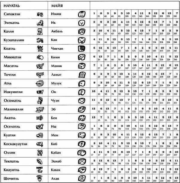 Илл. 61. Таблица календарных расчетов циклов майя-науа в 260 и 365 дней, составленная польской исследовательницей Лижбетой Шаркевич