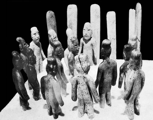 Было написано немало работ, в которых предпринимались попытки понять смысл и назначение этих памятников. Однако дело осложнилось еще и тем, что по мере удаления от «метрополии» ольмеков стали обнаруживаться головы размером поменьше, а также круглые каменные шары, имевшие что-то неуловимо общее с ольмекскими головами. Так, например, в расположенном у Тихоокеанского побережья на границе с Гватемалой центре Исапа, существовавшем чуть позже ольмеков, круглые шары небольшого размера были обнаружены рядом с маленькими каменными столбами, которые вполне могли служить для них подставками.