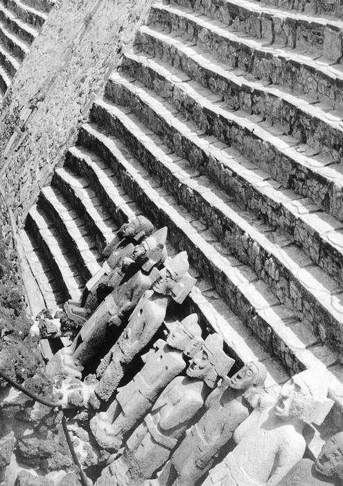 Илл. 73. Фигуры, условно названные «знаменосцами», были обнаружены в районе Главного храма Теночтитлана. Изображенные персонажи – явно не божества, но кто являлся их реальным прототипом, остается только гадать