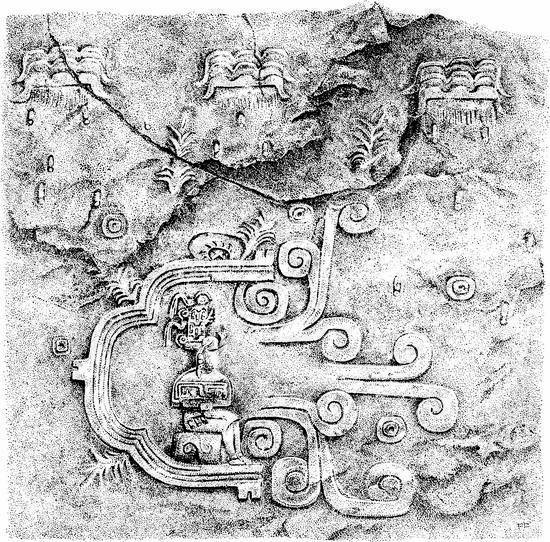 Илл. 93. Одно из наиболее древних изображений пещер на ольмекском рельефе из Чалькацинго. Внутри пещеры сидит главный прапредок племени – Бог-Улитка. Завитки напоминают символы крови в сценах жертвоприношений
