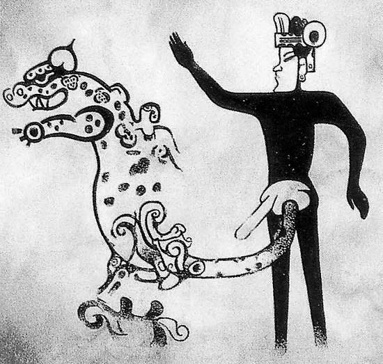 Илл. 94. Пещера считалась не только местом погребений и проведения ритуала кровопускания. С ней связывались и обряды, носившие отчетливый сексуальный характер и выражавшие идею реинкарнации. Изображение из пещеры Оштотитлана