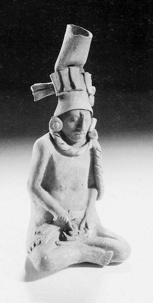 на мысль об их ритуальном значении. Особенно если вспомнить историю с «распятым» младенцем в Мани, чей труп со стигмами также был обнаружен в пещере. По всей видимости, речь идет именно о специальных «отправлениях посланников». Небогатый, как правило, инвентарь свидетельствует о невысоком социальном статусе захороненных в пещерах, что подтверждает версию жертвоприношений. Практически все захоронения в пещерах подходят под эти характеристики, за исключением, пожалуй, Чичен-Ицы, где кремация практиковалась как одна из форм захоронения.Илл. 95. Фигурка, изображающая обряд кровопускания, осуществляемый знатным майя. Для совершения подобного требовалось немалое мужество