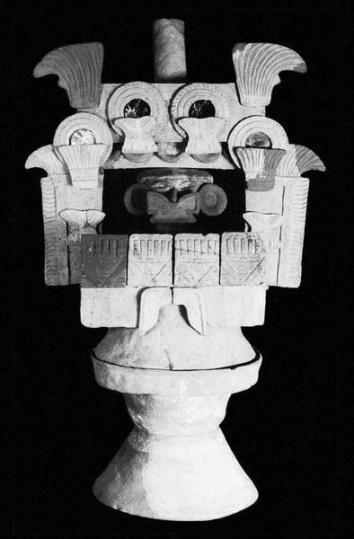 и обнаружила здания со множеством настенных росписей и великолепной цветной керамикой. Сежурне сразу же решила, что древние жители города запечатлели на стенах дворцовых залов сюжеты мифа о Кецалькоатле и символы космогонической концепции «пяти солнц», известной нам лишь в более позднем астекском варианте. Это была красивая, но бездоказательная версия, и многие ученые сразу же выдвинули к ней множество претензий. О чем же можно говорить с уверенностью? Фрески Теотиуакана включают как ритуальные и мифологические, так и военные и бытовые сцены. Они отражают различные стороны жизни обитателей великого города. Сюжеты могут быть мифологическими: Пернатый Змей, различные божества (воды, огня), Бог Улитка. Могут затрагивать официальные исторические события, в которых участвуют воины-орлы и воины-ягуары. Представляют ритуальные и бытовые темы: храмы, инкрустация зубов, человеческие сердца и кровь, жертвоприношения, связанные с прорицаниями психоделические практики, игра в мяч, купание и другие коллективные забавы. А также передают значимые для теотиуаканцев символы и образы: речевой завиток, раковины, растения и животные, огороды-чинампы и т. д.Илл. 10. Терракотовая курильница из Теотиуакана. Этот причудливый стиль был назван исследователями «театральным»