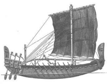 Там историки представляют себе торговое судно этрусков. Морского руля еще нет, управление осуществляется веслами, расположенными с двух бортов.