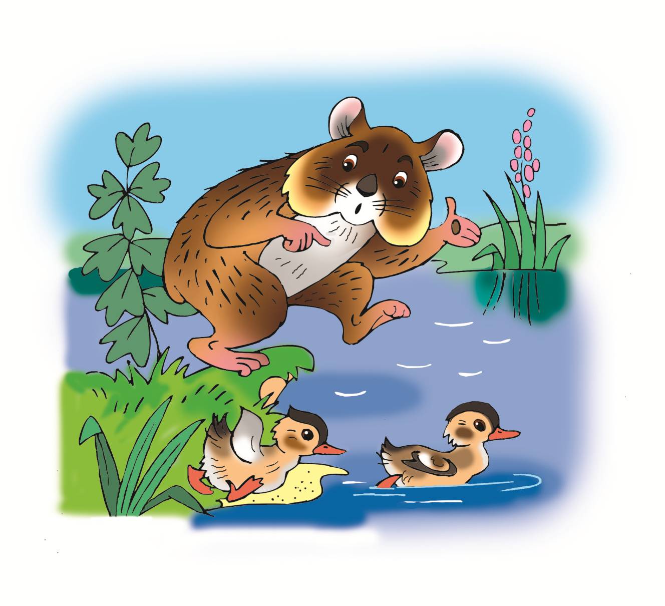 Путешествовал Хомячок по степи и увидел небольшую речку. А по берегу речки, друг за дружкой весело шагают Утята, не спеша входят в воду и двигаются к середине речки.