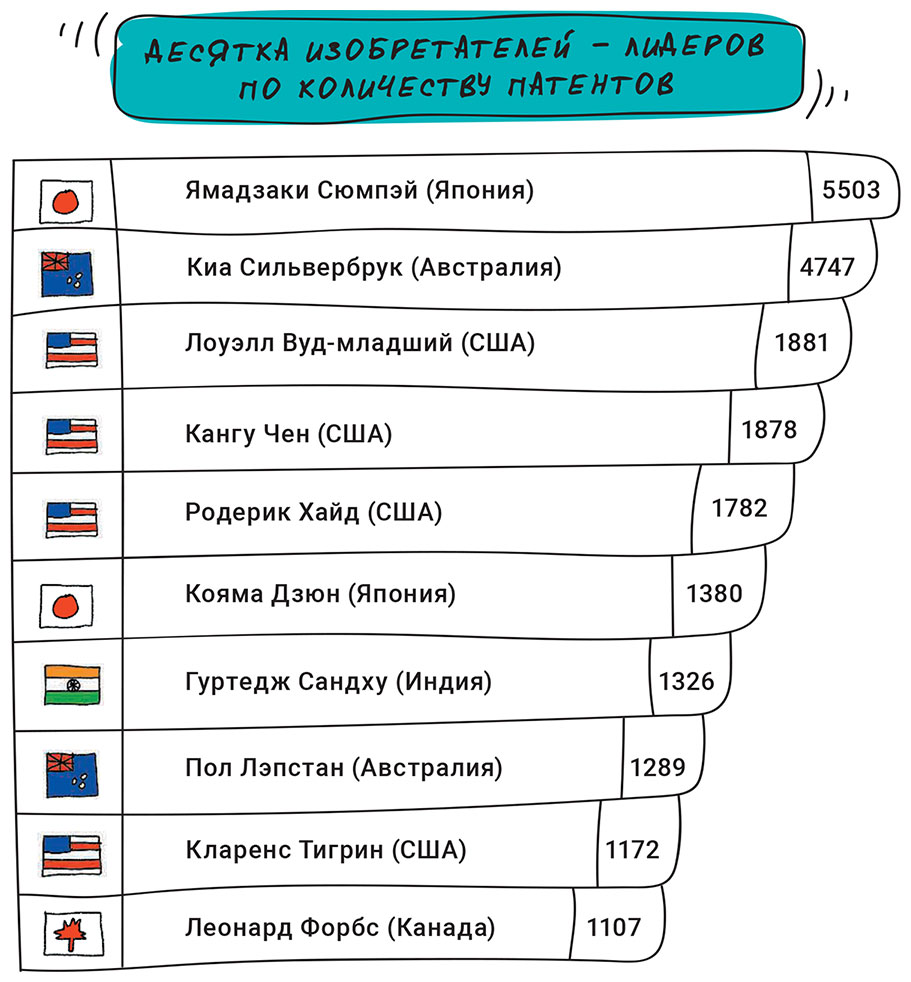 Сегодня известно 14 человек, имеющих более 1000 патентов – национальных или международных. Однозначный рекордсмен среди них – японец Ямадзаки Сюмпэй, владелец компании по разработке компьютерных дисплеев. Всего Ямадзаки получил 5503 патента на разные изобретения!
