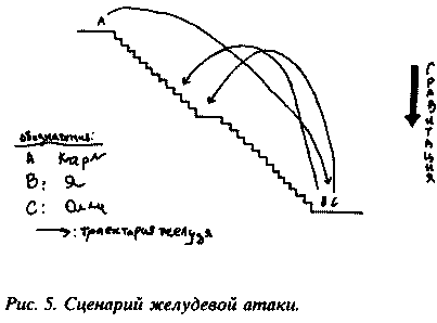 С этими словами он достает что-то из кармана и швыряет в нас. Это что-то ударяется об стену прямо у меня над головой и рикошетит к колесу моего велика. Это желудь. Чтобы поднять его, придется слезть с велосипеда. Но и оставить желудь просто так я не могу. А потому спешиваюсь, прислоняю велик к стене, поднимаю желудь и швыряю обратно в Карла, но без толку. Мне не удается добросить даже до средних ступенек. А все из-за силы тяжести. (См. Рис. 5.)