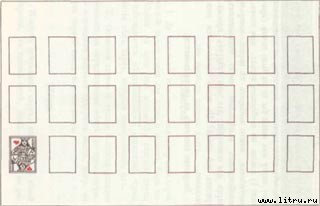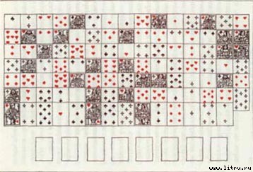 Разложивши первый рядъ изъ двђнадцати картъ, раскладываютъ точно также всю колоду на ряды, покрывая рядъ за рядомъ.