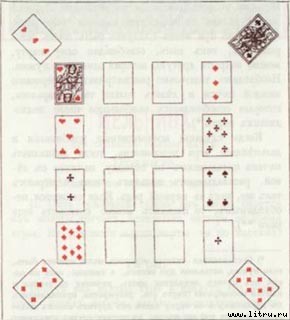 Кладутъ двђнадцать картъ, начиная съ лђвой стороны, въ такомъ видђ, какъ показано на рисункђ. Сперва кладутъ верхнюю угловую карту, потомъ четыре боковыхъ карты и, наконецъ, нижнюю угловую карту. То же самое повторяютъ съ правой стороны, начиная съ верхняго угла и оставляя въ срединђ мђсто для основныхъ картъ.