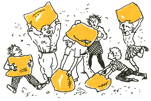 Гвоздём программы была жаркая битва — битва подушками. Одна подушка лопнула, и тут пух тучами закружился в воздухе. Фелицита даже чуть не проглотила одну пушинку, потому что хохотала с открытым ртом. А под конец вся семья ползала на четвереньках по двору и собирала пух-перо, чтобы запихнуть его обратно в наволочку. А Эрих в восторге заявил: «На мой одиннадцатый день рождения у меня только два желания: давайте опять устроим великую битву подушками, а ещё подарите мне целую миску клубники со взбитыми сливками!»